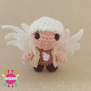 Si j’avais déjà fait l’expérience de crocheter des ailes d’ange (salut Castiel!), j’en ai profité cette fois-ci pour peaufiner ma technique… ce n’est pas parfait, mais personnellement j’aime l’aspect dynamique obtenu parce que les ailes ne sont pas parfaitement symétriques.