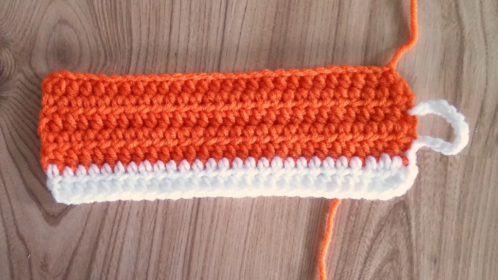 Rang 2-5) demi-br jusqu’à la fin, 2 ml et tournez (24) Joindre la laine blanche et coupe le fil orange.