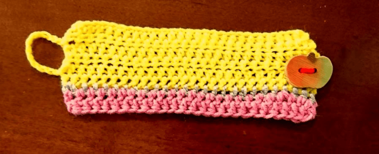 Rows 2-5) HDC to end, ch 2 and turn (27) at the end of row 5, change to gray, leave a 30 cm yellow tail (you will later chain it to form button loop)