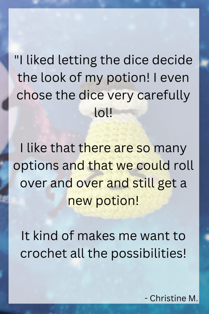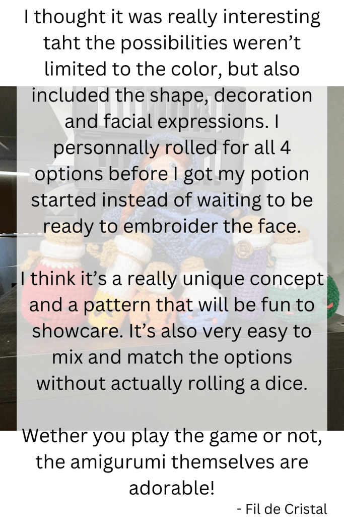 These adorable amigurumi will quickly become the prized posession of any gamer, rpg fanatic, alchemist and sorcerer alike! Add a little cord and you’ll have yourself the perfect bag charm for your next adventures!