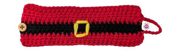Joindre la laine de la couleur du manchon (rouge, verte ou beige) à la fin du rang 3, faire une chainette de 12 mailles et joindre à la fin du rang 5 avec une mc. Cet anneau vous permettra de refermer votre manchon autour de votre tasse. Fermez l’ouvrage et rentrez les fils. Cousez un bouton de votre choix à l’opposé de l’anneau de fermeture.