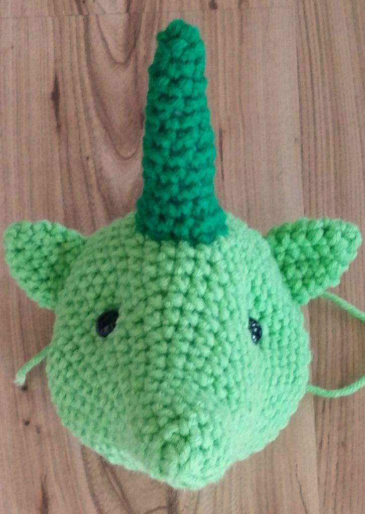 Coudre les oreilles de chaque côté de la tête, légèrement décalées du centre et vers l’arrière autour du rond 26 et coudre la corne centrée entre les oreilles, mais vers l’avant (entre les ronds 20 et 23). Rentrez tous vos fils. Coudre la tête au corps très solidement car la crinière sera lourde.