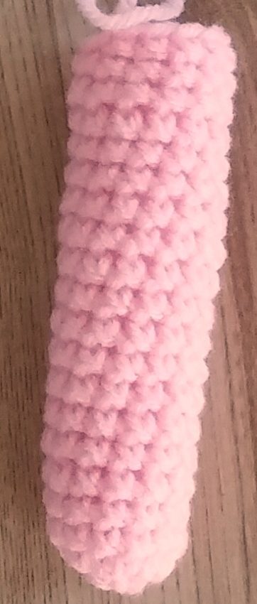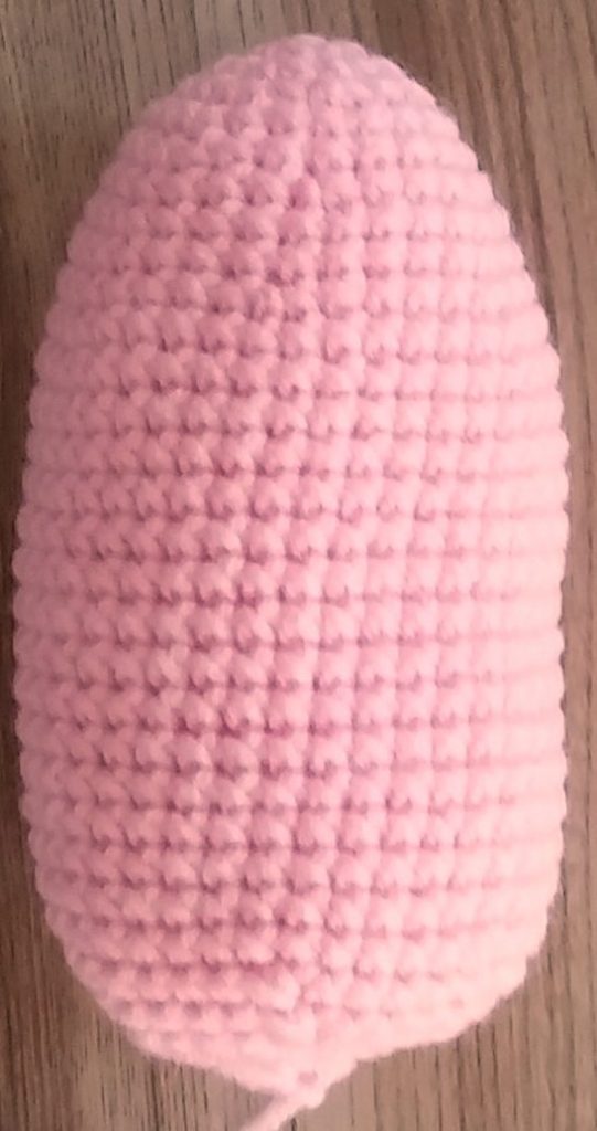 La tension importe peu en autant que vos mailles soient assez serrées pour ne pas laisser entrevoir la bourre ou que celle-ci s’échappe. Toutes les parties sont faites en spirale, c’est-à-dire sans joindre à chaque rond. Vous pouvez donc utiliser un marque maille ou alors faites attention de bien compter vos mailles.