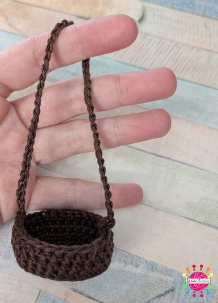 à la suite du dernier tour de la balançoire, ml x 50 (vous pouvez faire une chaînette plus longue si vous le voulez), sautez 15 mailles du tour 7 de la balançoire, mc. Fermez l’ouvrage et rentrez les fils.