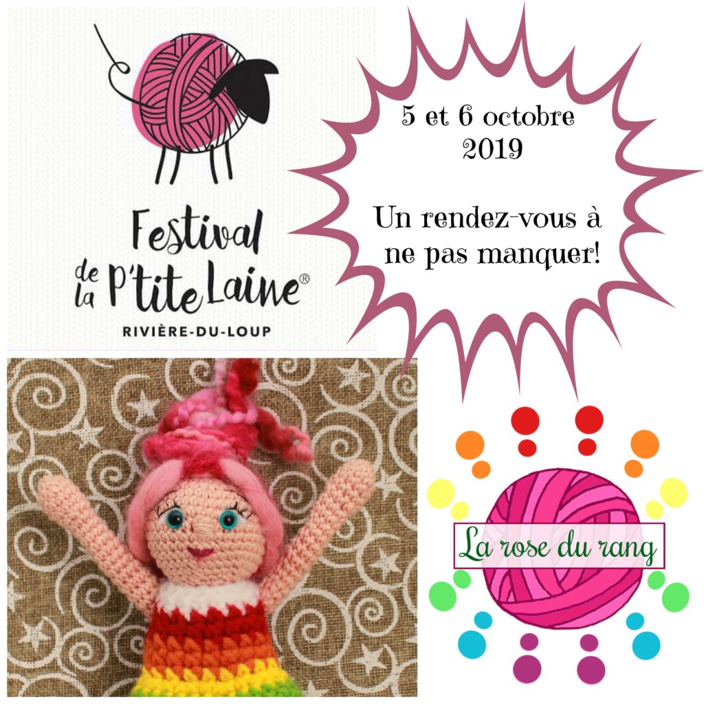 Le décompte est enclenché; dans moins d’un mois se sera le Festival de la p’tite laine à Rivière-du-loup! J’y serai pour la cinquième année consécutive (et oui, j’y suis depuis la toute première édition!!) avec mes patrons, mes ensembles prêt-à-crocheter… et Sandra de l’amas de laine qui m’accompagnera pour vous jaser La rose de laine!